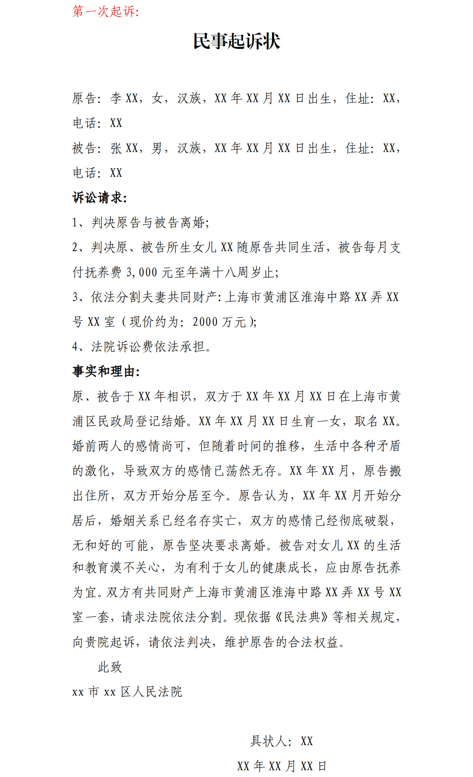 離婚起訴書是發(fā)起離婚訴訟程序的最基本的法律文書,包含以下內(nèi)容: