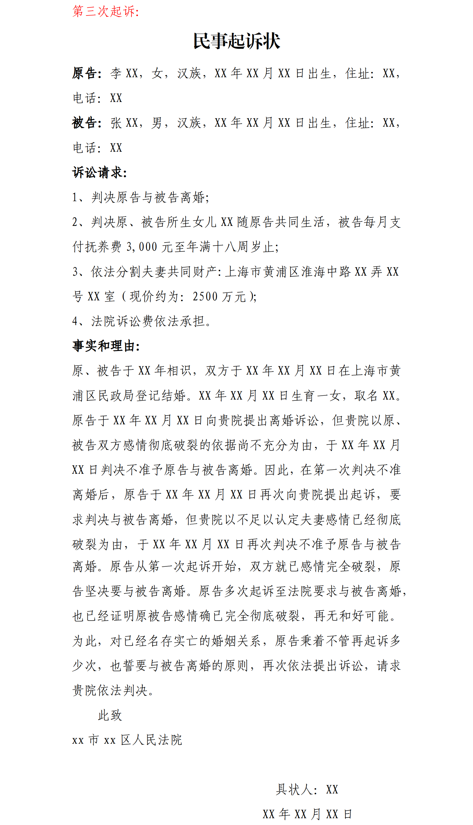 3、寫明起訴時所送交人民法院的名稱,原告人自我簽名或蓋章,起訴的時間。