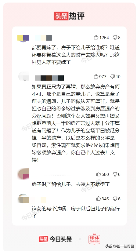此事引發(fā)網(wǎng)友們的熱議,有網(wǎng)友表示:“老人需要個伴兒而已,孩子應該理解母親,如此咄咄逼人,有些過了!”也有網(wǎng)友表示:“都要嫁人了,不把房子給兒子,難道要帶著這么大的財產(chǎn)嫁人?圖的啥?”還有網(wǎng)友表示:“這樣的兒子,能指望著養(yǎng)老嗎?要房子,做個婚前財產(chǎn)公證,誰也拿不走,留給自己養(yǎng)老。”