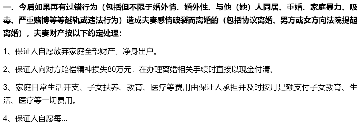 實(shí)踐中,有些女同胞(不排除男同胞)為了獲得安全感,會(huì)要求另一方承諾保證不得出軌,否則所有財(cái)產(chǎn)歸女方(不排除為男方)。有的情況是,在發(fā)現(xiàn)男方(或者女方)出軌的事實(shí)下,男方(或者女方)為了向女方(或者男方)保證悔改的爭(zhēng)議,向妻子(萬(wàn)一是向男同胞呢)出具保證書或者簽署協(xié)議,寫明如若再犯,凈身出戶,連褲衩也不剩。